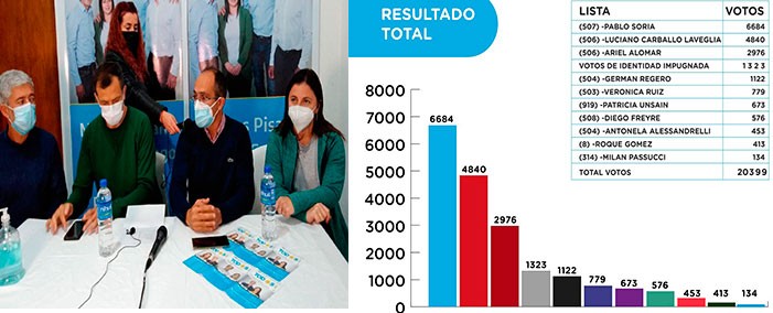 El intendente Marcos Pisano, al cierre de los cómputos habló en la sede de su partido, junto a los dos candidatos en primer lugar y Eduardo Bali Bucca.
