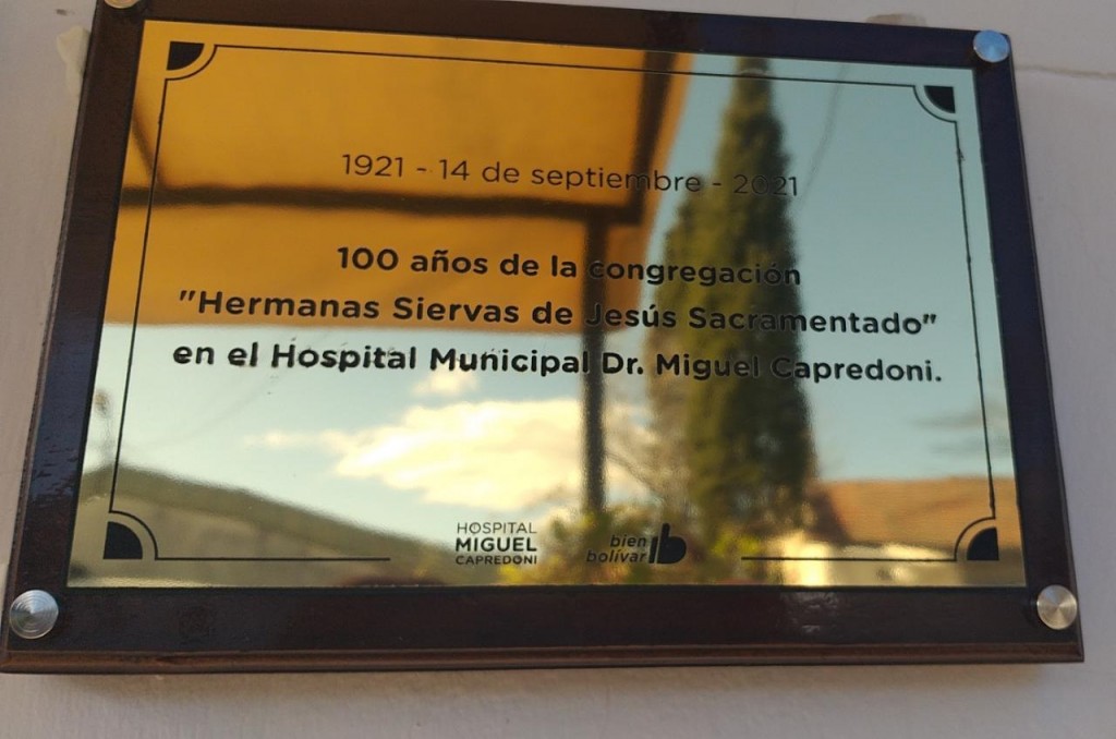 Hoy se cumplen cien años de la presencia de las Hermanas Siervas de Jesús Sacramentado en el Hospital Dr. Miguel Capredoni. Ese día en que se cumple un siglo de la Congregación al servicio de los enfermos en Bolívar, se descubrió una placa en el Hospital y a las 17:00 en la Parroquia se celebró la misa presidida por el Obispo de la Diócesis de Azul Monseñor Hugo Manuel Salaberry S.J..
