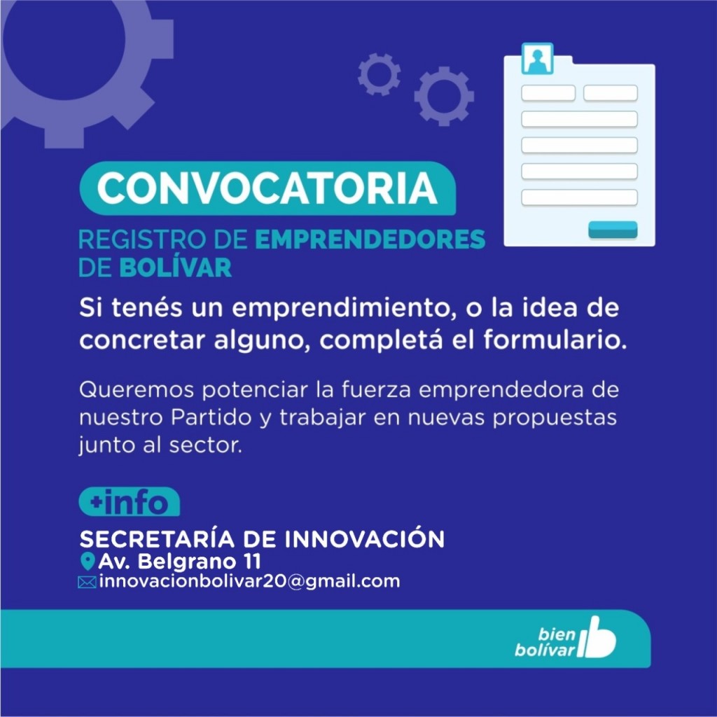REGISTRO DE EMPRENDEDORES DE BOLIVAR El Registro de Emprendedores Locales es una iniciativa que desarrolla la Municipalidad de Bolívar con la finalidad de impulsar el trabajo de los bolivarenses, para visibilizar y reunir en un mismo espacio la diversidad de emprendedores que existen en nuestra ciudad y las localidades y potenciar su fuerza creativa. Pueden registrarse quienes tienen un proyecto en marcha o una idea a desarrollar, tanto en actividades productivas, de servicios como también cultural. La inscripción permite participar en capacitaciones, acceso al mercado y recibir información sobre financiamiento para los emprendimientos. Te invitamos a que nos cuentes lo que hacés, para poder potenciar tu emprendimiento !!! forms.gle