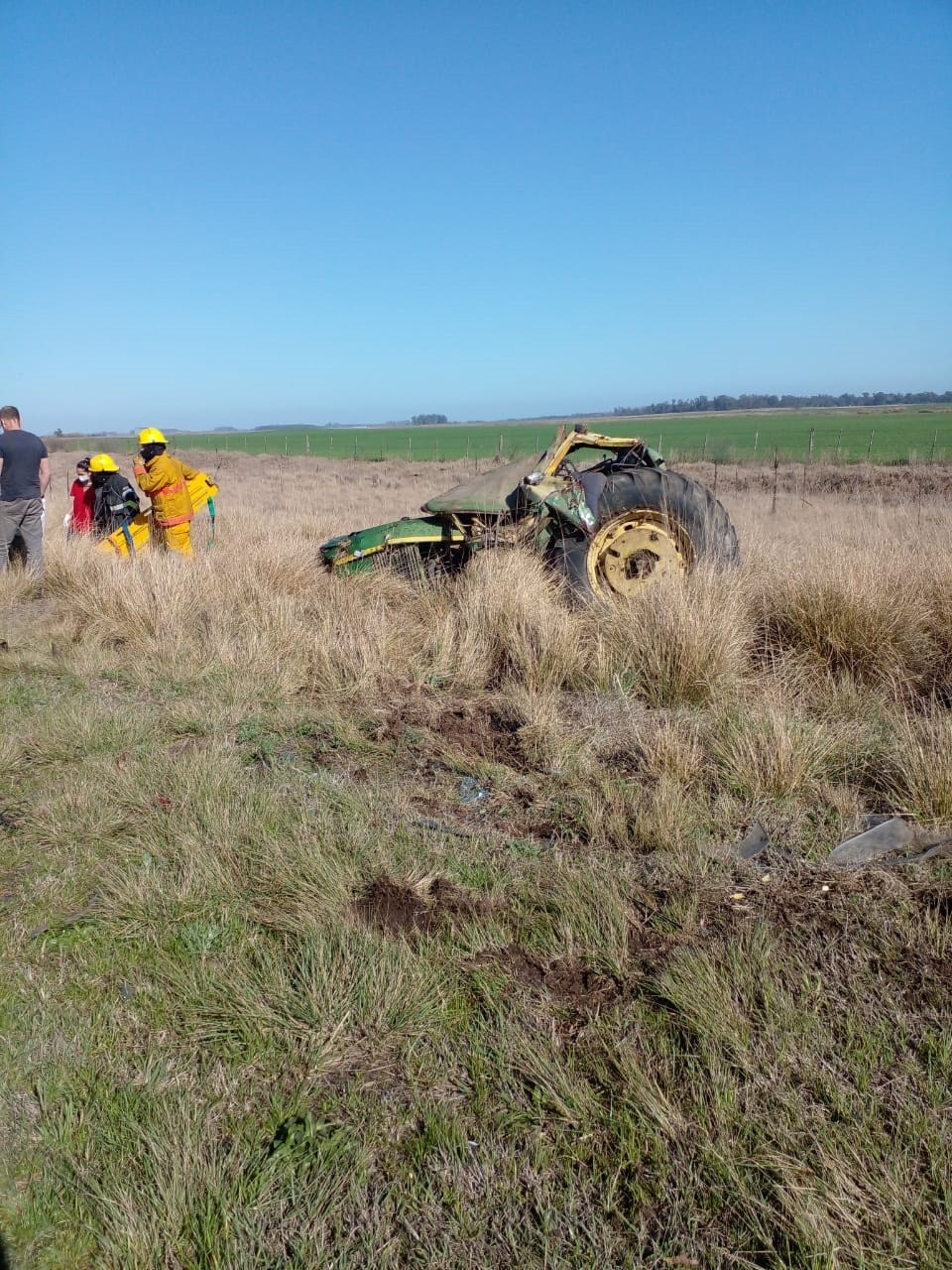 Tras el impacto, la maquinaria agrícola fue despedida hacia el préstamo de la ruta, resultando su único ocupante con heridas cortantes en el rostro, contusiones y excoriaciones lógicas del fuerte golpe. Fue trasladado rápidamente por una ambulancia de hospital de Pirovano, con el doctor Yacuzza y personal paramédico.