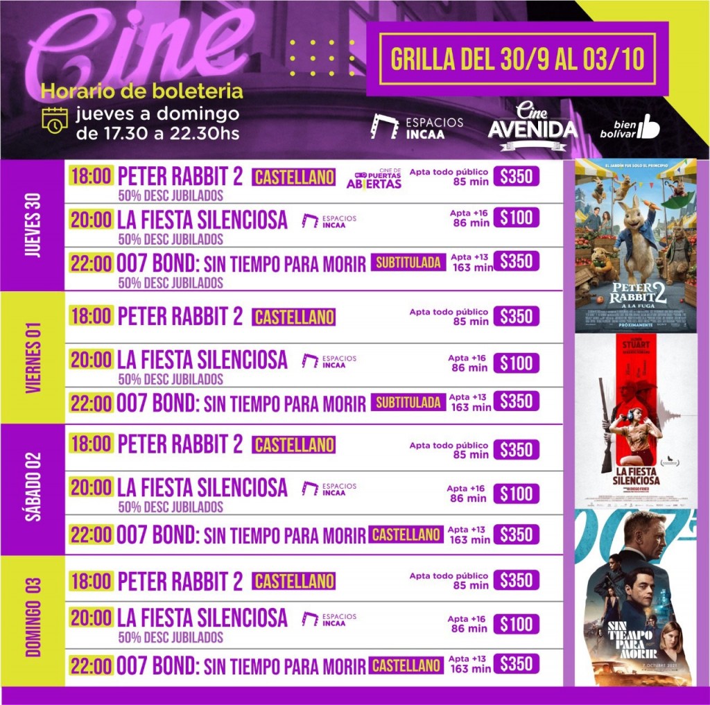 El Avenida renueva la cartelera desde el jueves 30 de septiembre al domingo 3 de octubre con “Peter Rabbit 2: A la fuga”, la vuelta del adorable conejo; la película argentina de suspenso y terror “La Fiesta silenciosa”; y el nuevo film de James Bond  “007 Bond: Sin Tiempo Para Morir”.