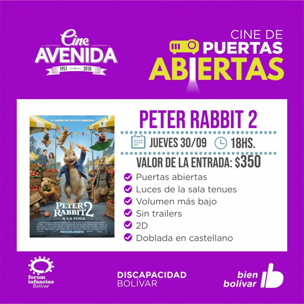 Además, el jueves 30 a las 18hs con “Peter Rabbit 2: A la fuga” se lleva a cabo una nueva función de la iniciativa Cine de Puertas Abiertas, que tiene como principal característica la proyección de la película con el sonido más bajo, las puertas de la sala abiertas y las luces encendidas, con el fin de garantizar el acceso de todas las personas al cine.