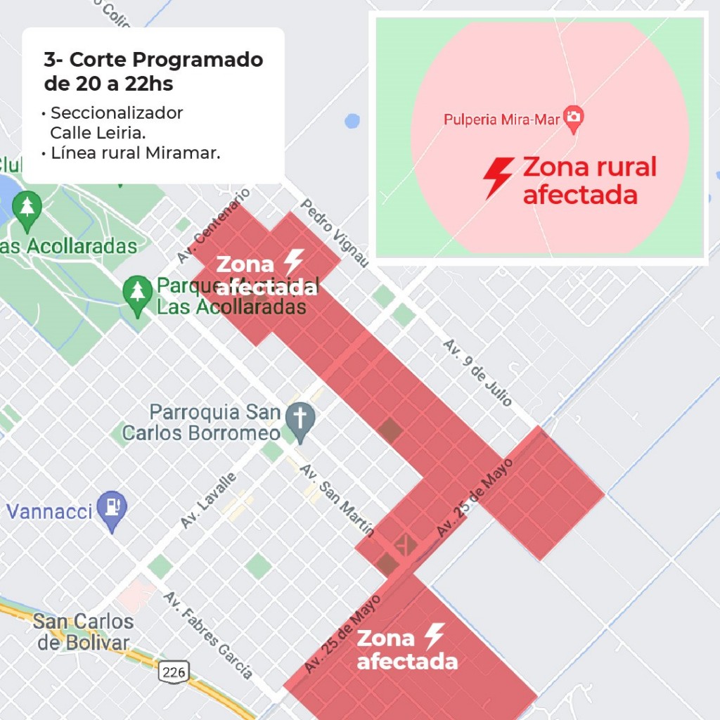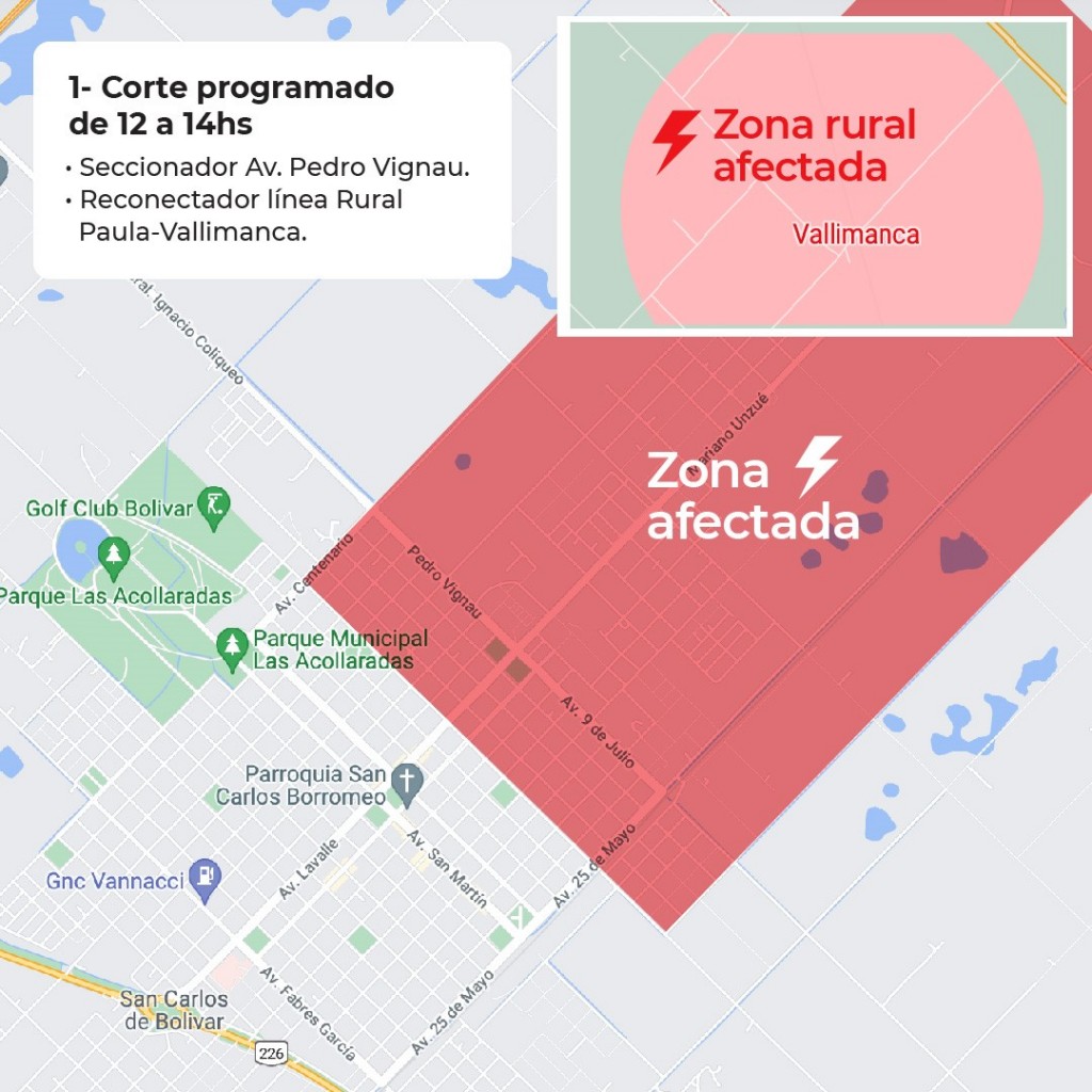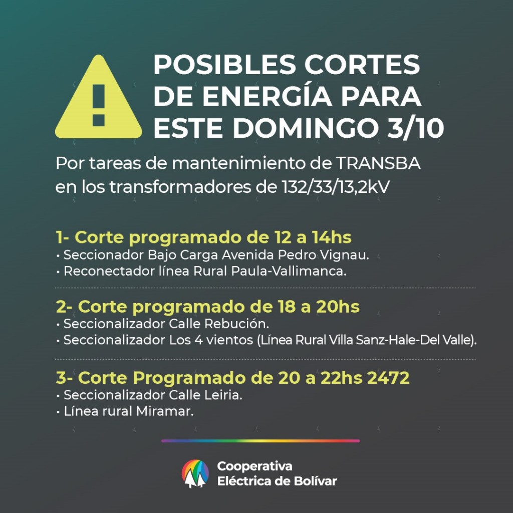 Para poder trabajar sobre los transformadores, es necesario sacarlos de servicio y es por ello que es posible, dependiendo del nivel de carga, que soliciten restricción de carga (Cortes del suministro eléctrico). En función del cronograma elaborado por EDEN, está previsto que tengamos en Bolívar este Domingo 3 de Octubre, una restricción de 1,8MW entre las 12 y las 14hs y una restricción de 2MW entre las 18 y las 22hs. A tal efecto, nos vemos obligados a cumplir con lo requerido por EDEN y es por ello que planificamos realizar las siguientes restricciones de carga: 1- Corte programado de 12 a 14hs 1. Seccionador Bajo Carga Avenida Pedro Vignau. 2. Reconectador línea Rural Paula-Vallimanca. Dichos cortes afectarán las siguientes zonas: