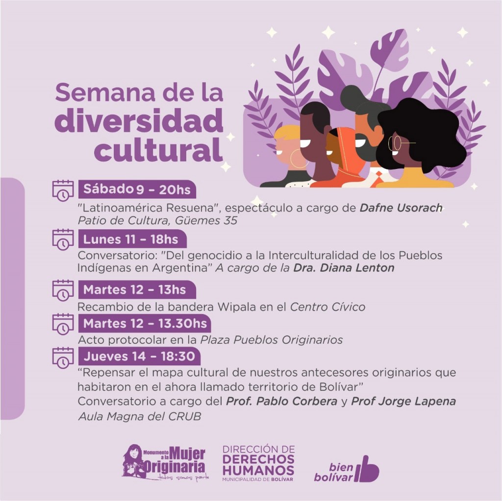 La Dirección de Derechos Humanos, en conjunto con el Colectivo Mujer Originaria de Bolívar, la Escuela de Estética, Cepeac y el CEF Nº5, propone una serie de actividades culturales, y eventos en el marco de la Semana de la Diversidad Cultural, que comenzará este viernes.