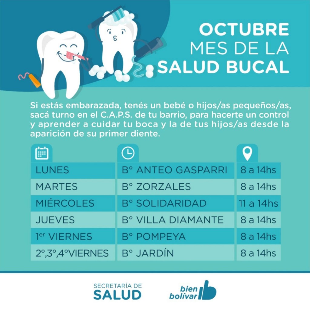Con el objetivo de prevenir enfermedades bucodentales y fomentar una correcta higiene y salud bucodental, especialistas estarán realizando controles gratuitos en los Centros de Atención Primaria de la Salud, ubicados en los diferentes barrios de Bolívar.