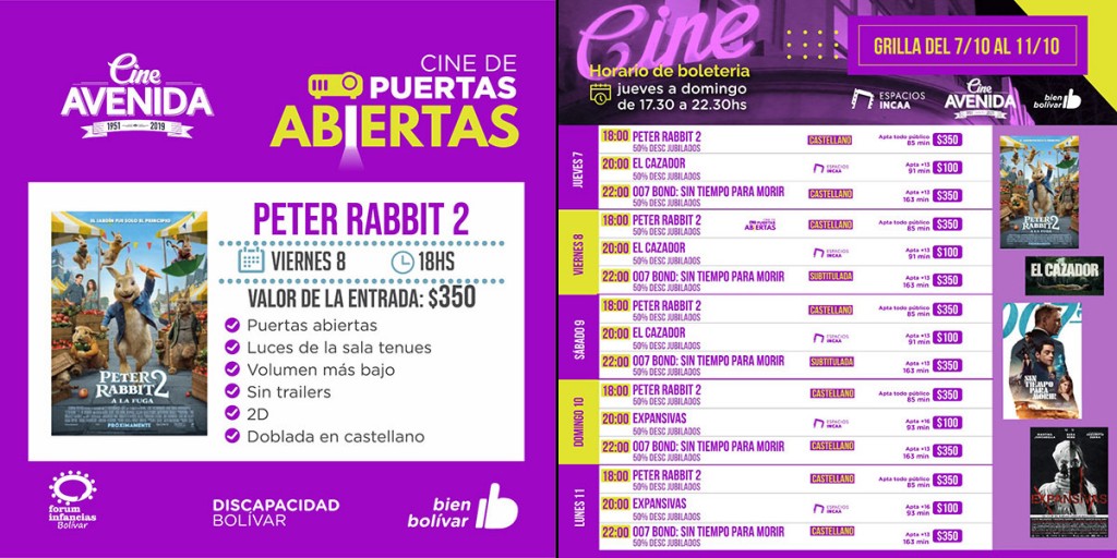El Cine Avenida preparó una oferta de lo más variada para este fin de semana largo de octubre con “Peter Rabbit 2: A la fuga”, la vuelta del adorable conejo; las películas argentinas “El cazador” y “Expansivas”; y el nuevo film de James Bond “007 Bond: Sin Tiempo Para Morir”.