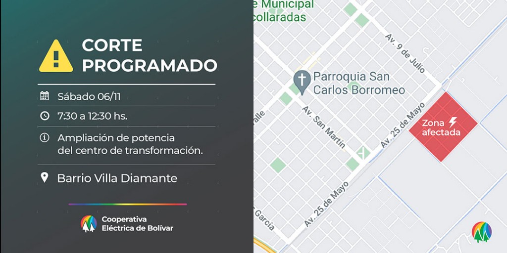 La Cooperativa Eléctrica de Bolívar informa sobre este corte programado para el próximo sábado 6 noviembre