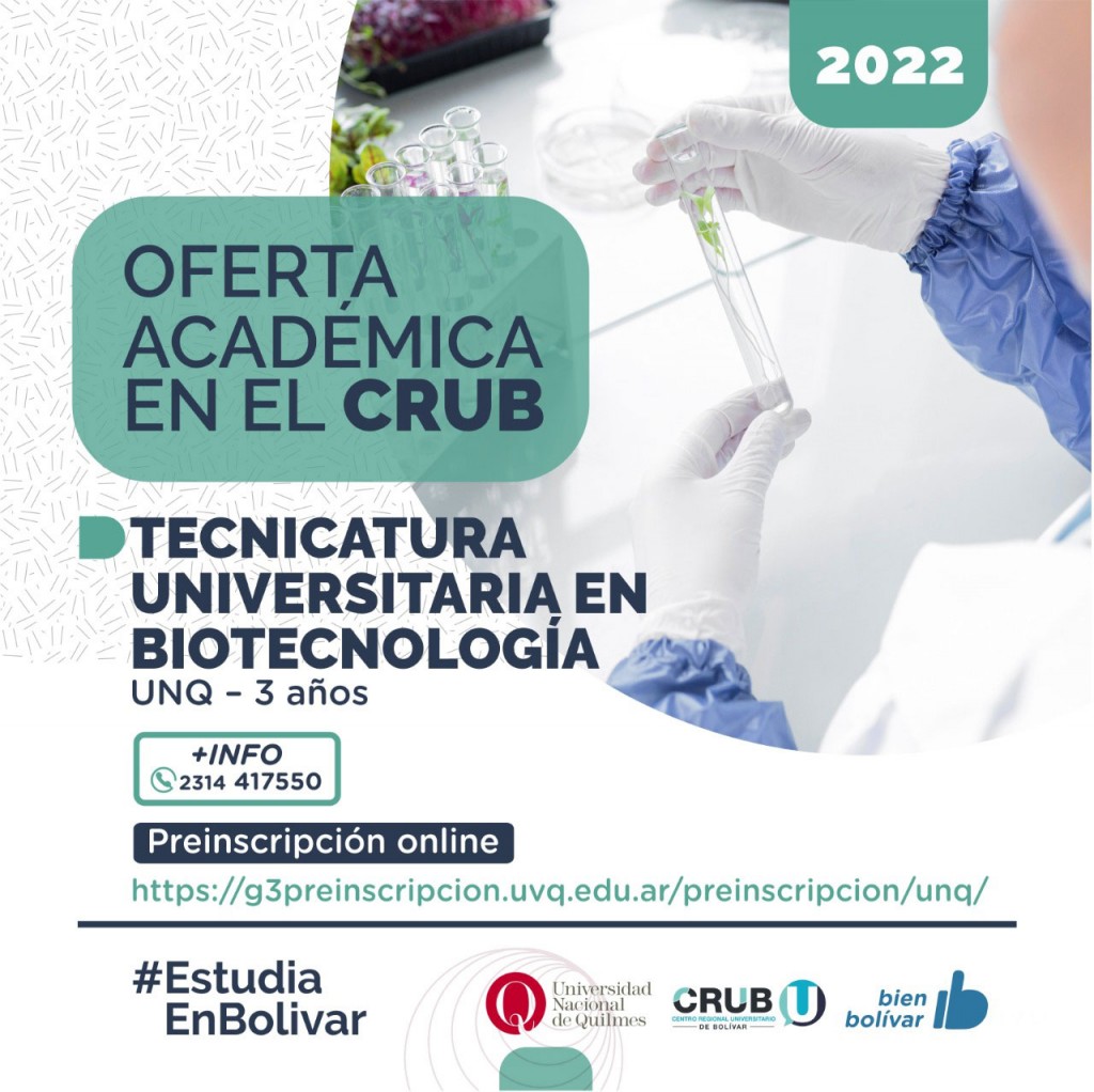 El Centro Regional Universitario Bolívar informa a la comunidad que se encuentra abierta, hasta el 1 de diciembre del 2021, la pre-inscripción online a la Tecnicatura Universitaria en Biotecnología de la Universidad Nacional de Quilmes.