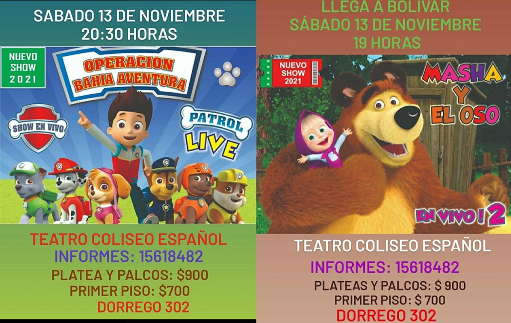 Masha y El Oso comienza a las 19:00hs, mientras que Patrol Live; Operación Bahía Aventura tendrá su inicio a las 20:00 horas, para ambos eventos la venta de entradas se realiza en Dorrego 302 o llamando al 15618482 y tienen valores que van de los $700 para primer piso y $900 para platea y palco.
