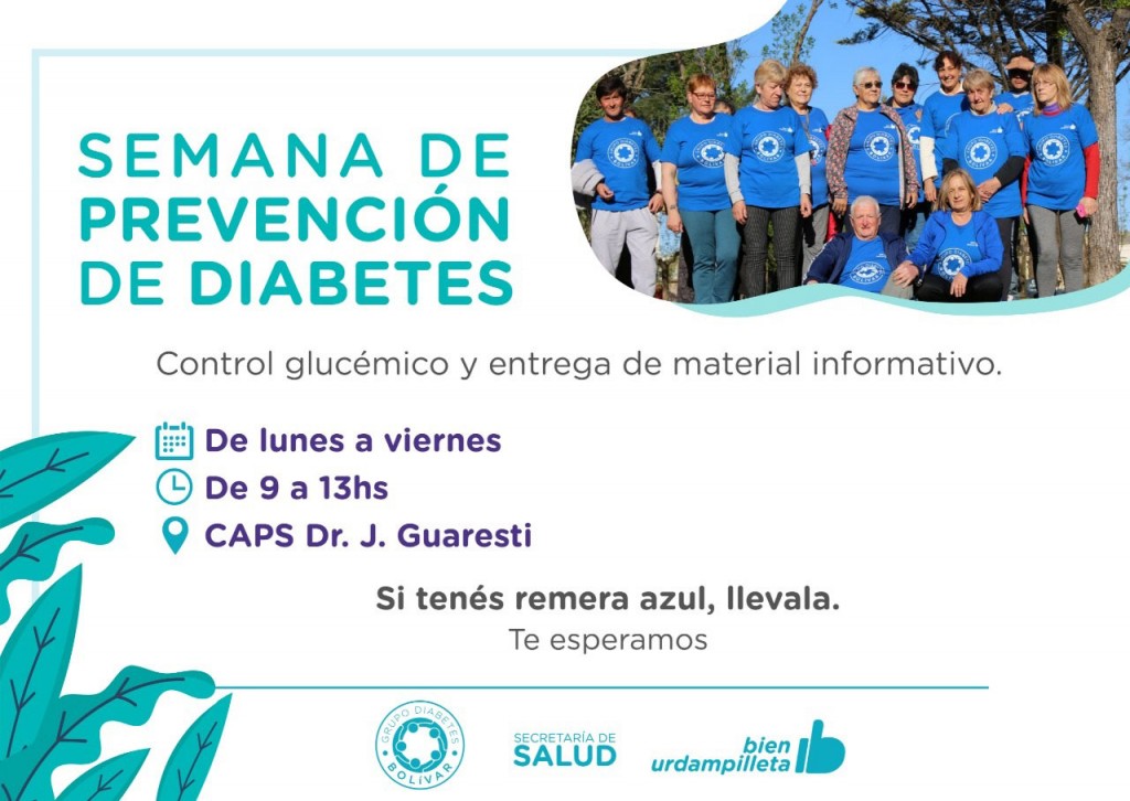 La caminata partirá este miércoles 17 a las 18.30hs desde el Centro Cívico, donde también habrá personal de salud haciendo controles glucémicos y entregando material informativo. Asimismo, en la localidad de Pirovano se realizará la misma actividad, a las 18hs en la plaza Rodolfo Pirovano. En tanto en Urdampilleta, durante la Semana de Prevención de la Diabetes se realizarán controles glucémicos en el Caps Dr. J. Guaresti, de lunes a viernes de 9 a 13hs.
