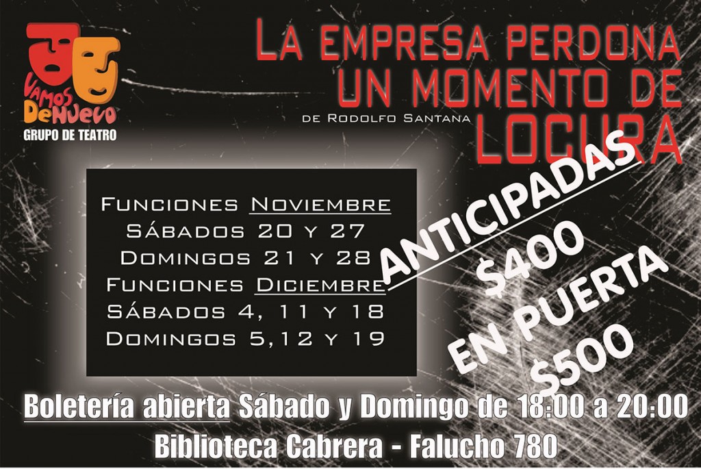 Sera la segunda propuesta propia estrenada por el Grupo de Teatro "Vamos de nuevo" de este año y tiene funciones programadas los días sábados a las 21:00 y domingos a las 20:00, al mismo tiempo podrá verse los fines de semana que restan de noviembre y buena parte de los de diciembre.