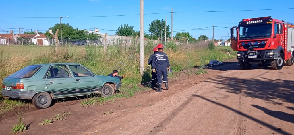 Bomberos trabajó para extraer un vehículo de la zona de cunetas en barrio Solidaridad