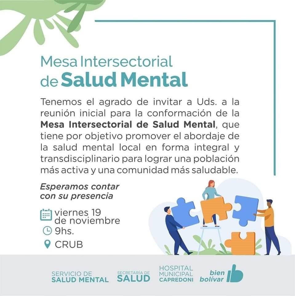 La primera reunión de la Mesa Intersectorial de Salud Mental, en la que participarán áreas municipales, referentes de la comunidad, y autoridades judiciales, se realizará el viernes 19 de noviembre, a las 9hs en el CRUB, allí se presentarán los objetivos de trabajo y se abordarán acciones conjuntas sobre los temas más relevantes en salud mental.