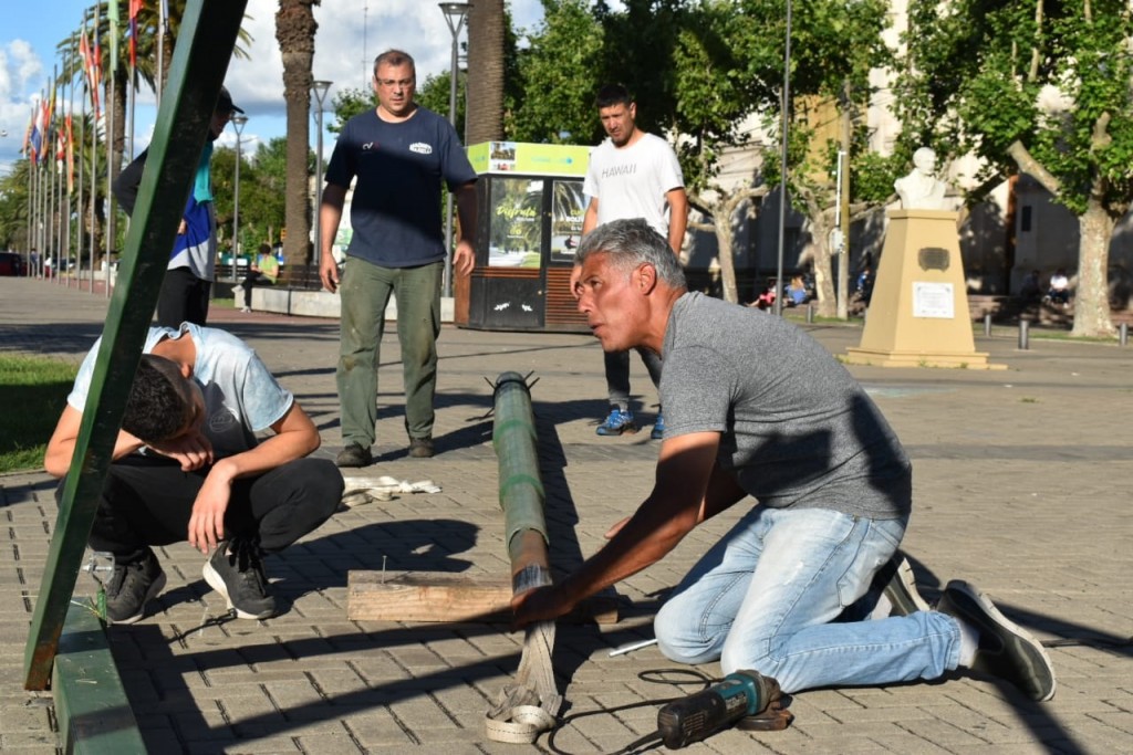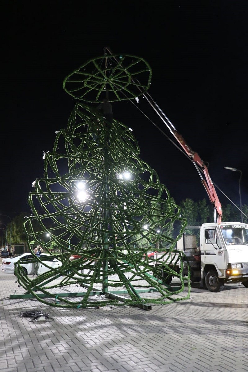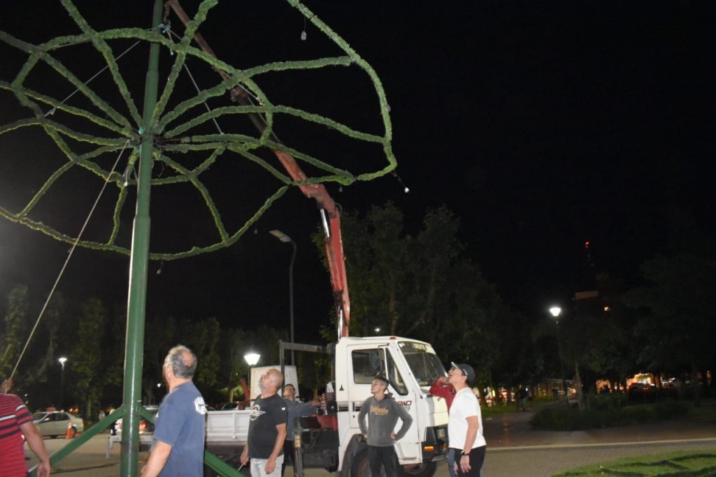 En colaboración con varias áreas municipales, se trabaja no solo en el armado del árbol sino también en lo que ha conexión eléctrica que cada año se reacondiciona y repara para que se pueda disfrutar del imponente árbol que cada año es el fondo de la gran foto familiar de la época navideña.