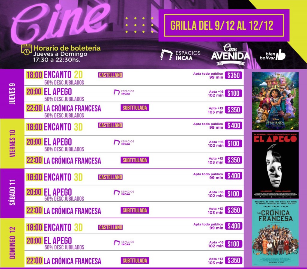 El Cine Avenida propone una cartelera variada para este fin de semana con La Crónica Francesa, de Wes Anderson; la película argentina El Apego de Valentín J. Diment; y continúa en cartelera Encanto, la nueva película de Disney.