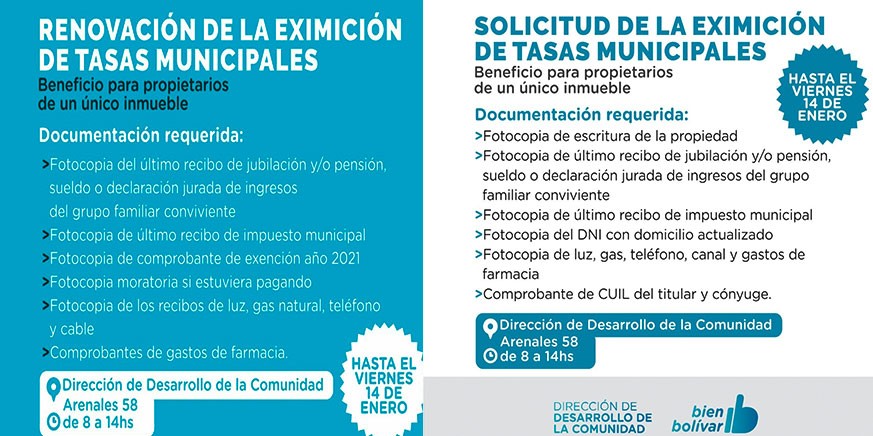 Es importante tener en cuenta que cualquiera de los dos trámites se puede realizar hasta el 14 de enero, de lunes a viernes de 8 a 14hs, en la Dirección de Desarrollo de la Comunidad, ubicada en Arenales 58.