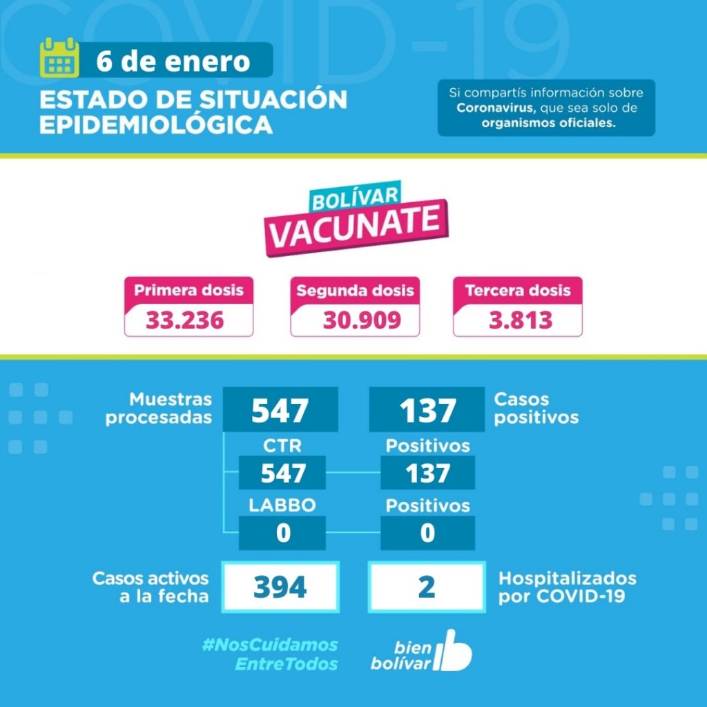 Cabe recordar que los bolivarenses vacunados con primera dosis suman 33.236, con segunda dosis 30.909 y tercera dosis 3813.-
