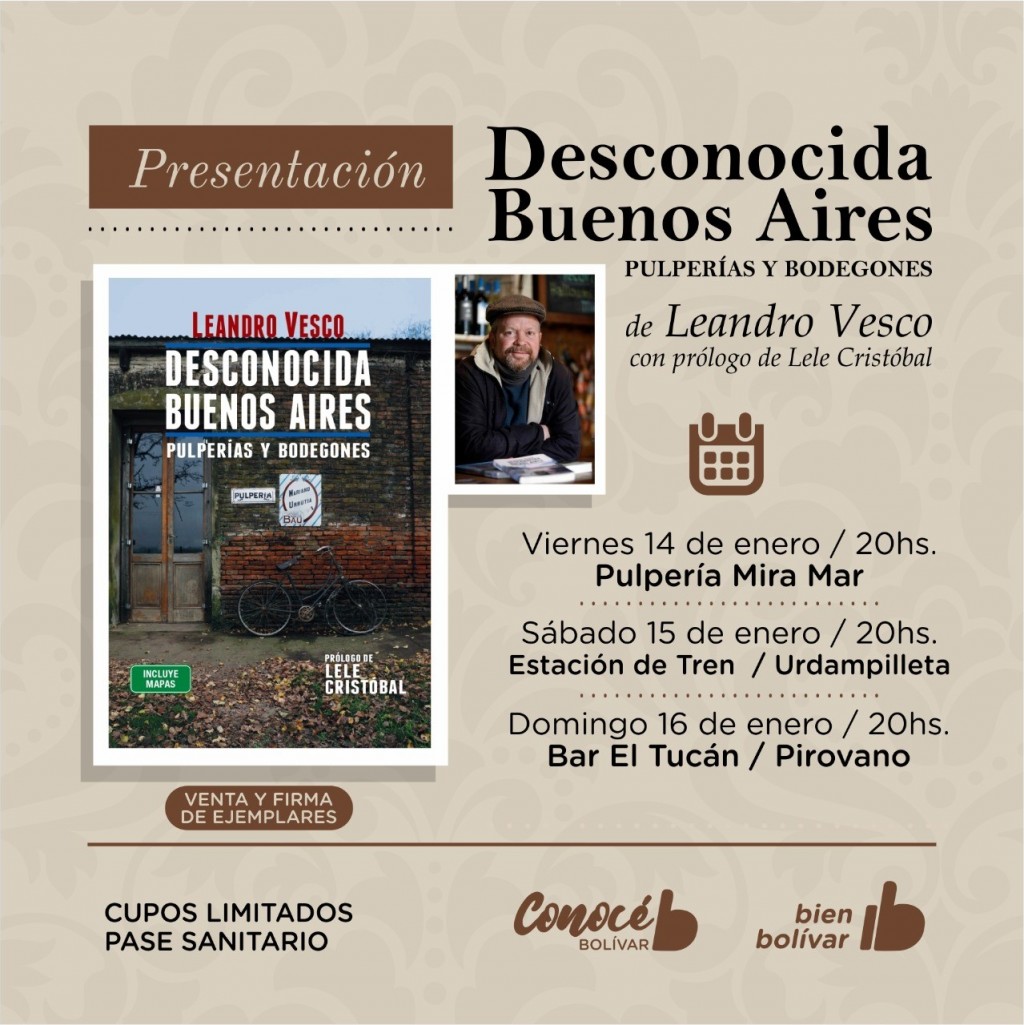 ESTE VIERNES LA MUNICIPALIDAD ACOMPAÑA LA PRESENTACIÓN DEL LIBRO "DESCONOCIDA BUENOS AIRES” DE LEANDRO VESCOEste viernes, a las 20hs en la Pulpería Mira Mar, el escritor Leandro Vesco presentará su libro "Desconocida Buenos Aires. Pulperías y Bodegones”, y desde la Dirección de Turismo el Municipio acompaña la iniciativa cultural. Esta mañana, el director de Turismo Emilio Leonetti junto a Vesco, brindaron detalles del evento que tendrá lugar en la famosa pulpería. "Estamos muy contentos de recibir a Leandro, este libro que tiene en la tapa a la Pulpería Mira Mar, y donde hay historias de Urdampilleta y Pirovano también, es muy positivo para Bolívar y el turismo rural", destacó Leonetti. Por su parte, Vesco sostuvo: " Presentar el cuarto libro de la saga en este lugar y junto a sus protagonistas, responde a una metodología de trabajo que sostengo, la de volver al lugar donde me confiaron historias".Además, a las 21.30hs luego de la presentación, quienes asistan al evento podrán disfrutar de una cena en el lugar por un valor de $1.500 la tarjeta. Los cupos son limitados y se solicitará pase sanitario para participar, las reservas se pueden hacer a los teléfonos 2314-624039 o 620031. En tanto, el sábado a las 20hs Vesco presentará el libro en la Estación de Tren de Urdampilleta; y el domingo 16 en el Bar El Tucán de la localidad de Pirovano.