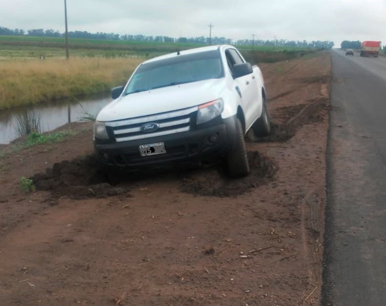 Fue esta mañana en ruta provincial 65 y Cacique Coliqueo, y si bien el episodio consistió en una simple encajadura, denota cómo está el suelo tras la abundante caída de agua.-