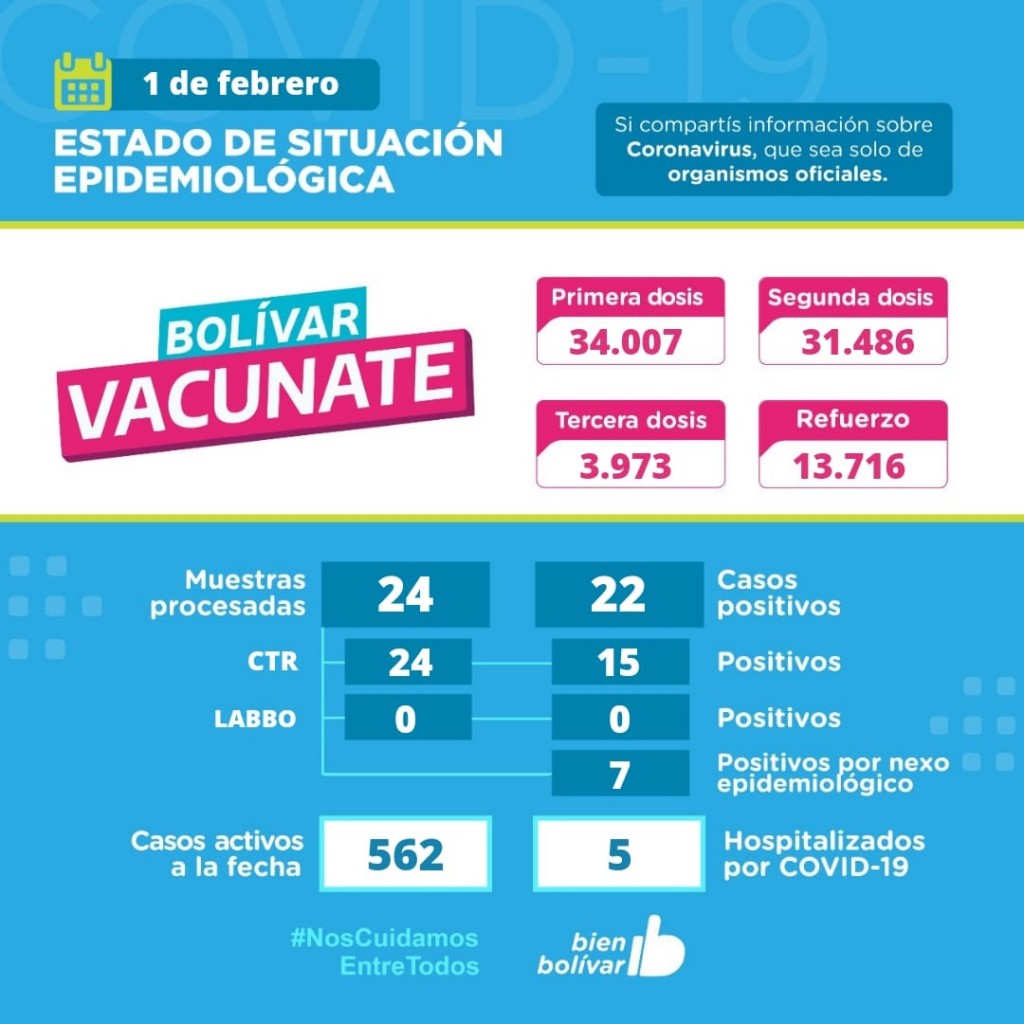 Desde el 3 de enero, se sumaron 871 bolivarenses al Plan Integral de Vacunación, colocándose su primera dosis y superando ya los 34 mil bolivarenses inoculados