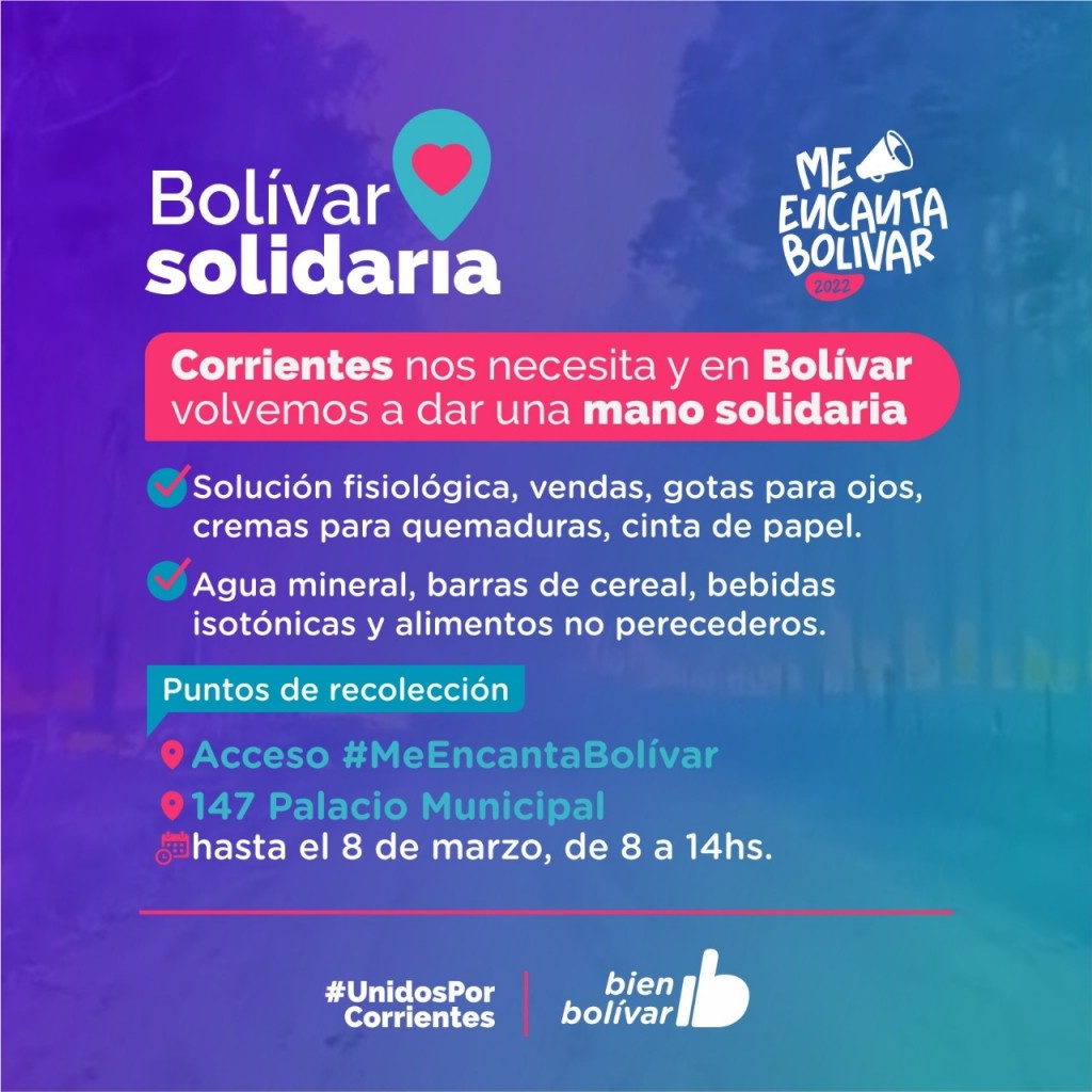 BOLÍVAR POR CORRIENTES   El intendente Marcos Pisano se puso a disposición de las autoridades y entidades de la provincia para solidarizarse con la situación y, entendiendo las necesidades establecidas por la Casa de La Provincia de Corrientes en Buenos Aires, se diagramaron los puntos de recolección en la ciudad.   Las donaciones serán luego enviadas a la provincia, y a las asociaciones y entidades que trabajan junto a bomberos y diversas organizaciones frente a los diversos focos.    Los/as interesados/as podrán acercar sus donaciones hasta el día 8 de marzo, y entre los pedidos sugeridos se encuentra; solución fisiológica, vendas, gotas para ojos, cremas para quemaduras, cinta de papel, agua mineral, barras de cereal, bebidas isotónicas y alimentos no perecederos .   Los puntos de recolección serán el acceso al festival “Me Encanta Bolívar” en el Parque Las Acollaradas, y la oficina de atención a la comunidad “147”, que funciona de 8 a 14hs en el Palacio Municipal.
