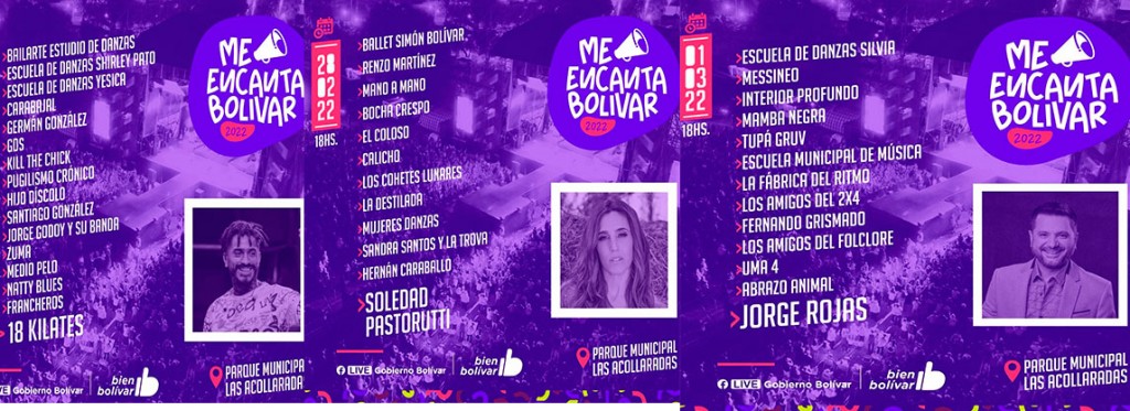 El domingo 27, Me Encanta Bolívar 2022 contará con la presencia de Bailarte Estudio de Danzas; Escuela de Danzas Shirley Pato; Escuela de Danzas Yesica Carabajal; Germán González; GDS; Kill the Chick; Pugilismo Crónico; Hijo Díscolo; Santiago González; Jorge Godoy y su Banda; Zuma; Medio Pelo; Natty Blues; Francheros; y el cierre tropical estará a cargo de la banda 18 Kilates.