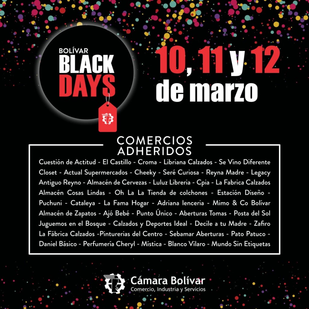 Los días 10, 11 y 12 de marzo tendrá lugar una nueva edición del Bolívar Black Days, y alrededor de 50 comercios estarán ofreciendo importantes descuentos y beneficios según el rubro al que pertenezcan.