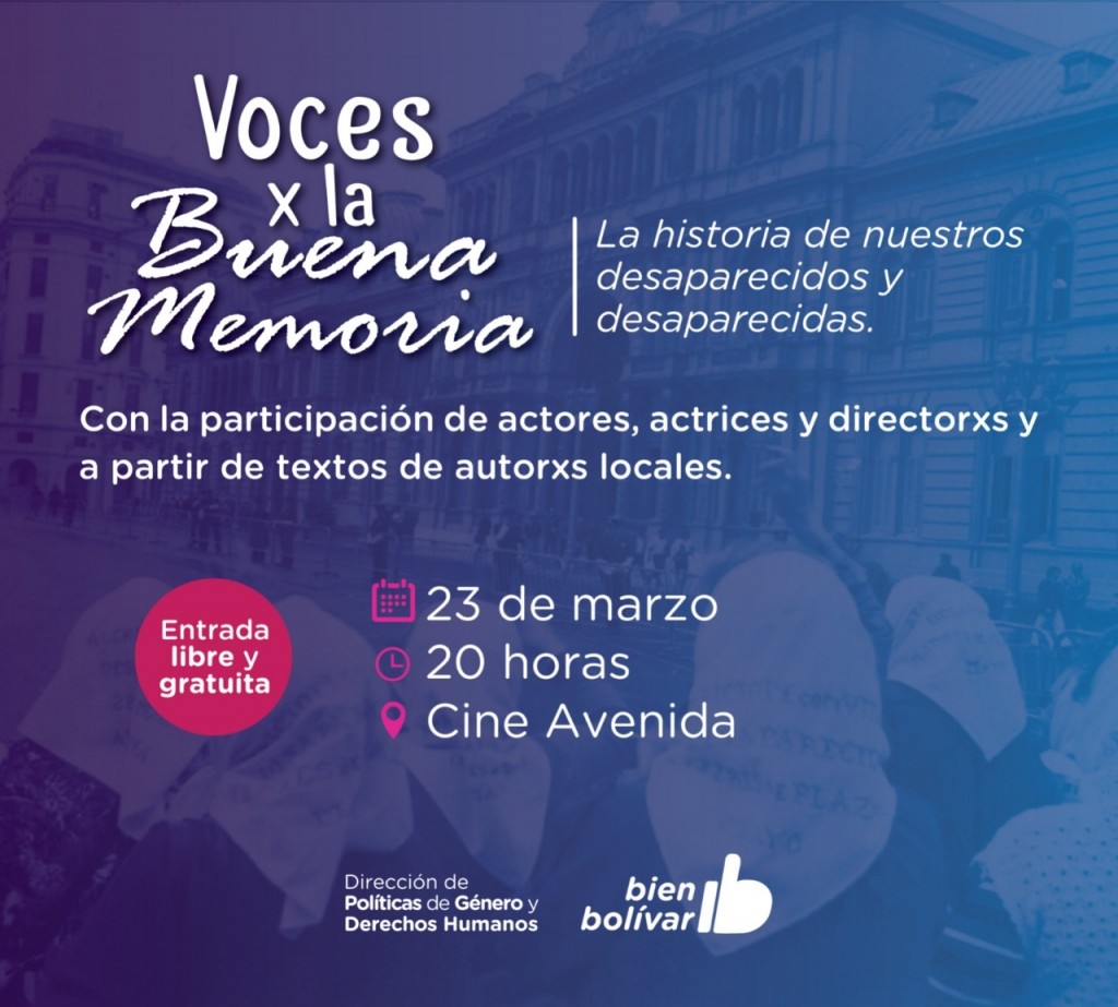 Se trata de un evento teatral que incluye una serie de micro-monólogos, de autores/as locales, basados en las historias de los desaparecidos/as bolivarenses. Será a las 20hs con entrada libre y gratuita.