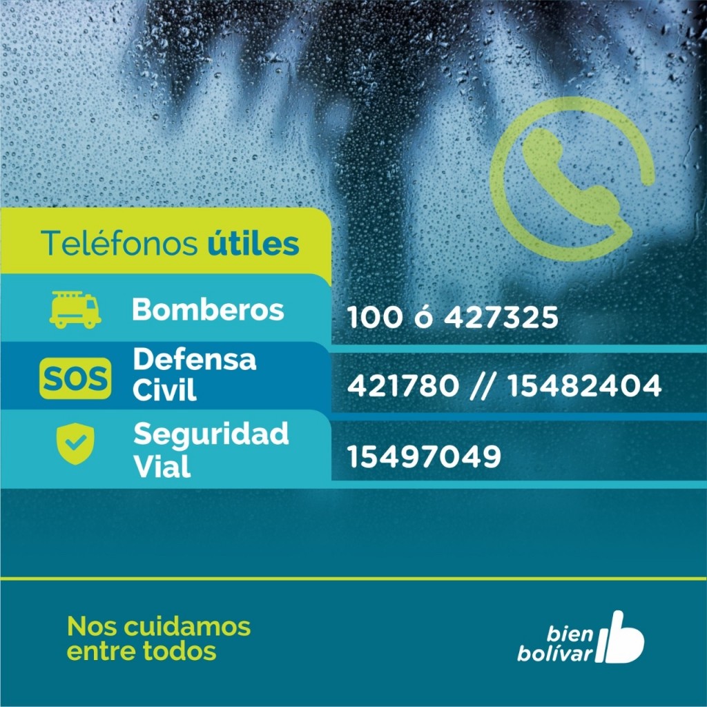 Ante cualquier emergencia, la Municipalidad de Bolívar pone a disposición de la comunidad los números telefónicos de Defensa Civil: 421780/15482404 y Seguridad Vial: 15497049