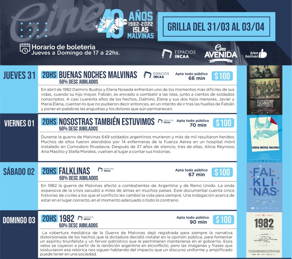 Con motivo de seguir construyendo memoria, el Cine Avenida junto al Espacio INCAA proponen una grilla especial del 31 de marzo al 3 de abril, para conmemorar el 40° aniversario de la gesta de las Islas Malvinas.