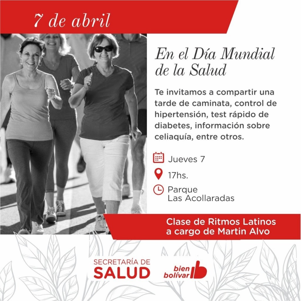 Para conmemorar el Día Mundial de la Salud, la Secretaria de Salud Municipal invita a toda la comunidad a sumarse a las actividades recreativas que se desarrollarán este jueves 7 de abril a las 17hs en el Parque Las Acollaradas.-
