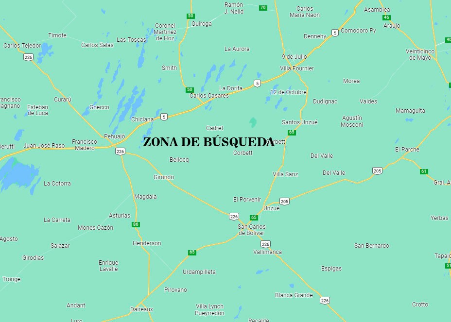 Este lugar dista a 41 kilómetros a campo traviesa de la Cabaña El Rincón, y circulando por los caminos rurales, a 65. Parte del dispositivo de rastrillaje debio trasladarse hasta la intersección de rutas 5 y 50 en horas de la mañana, visiblemente complicado por las lluvias que se están dando en la zona centro de la provincia de Buenos Aires.-