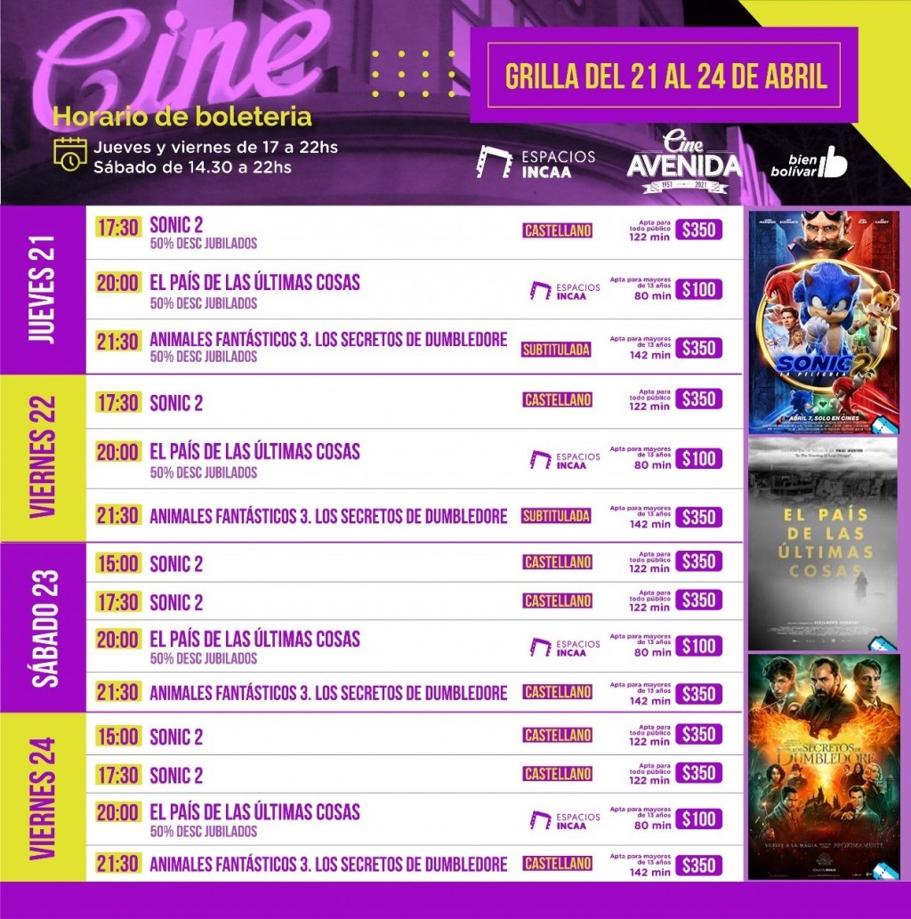 El Cine Avenida propone una cartelera variada para este fin de semana con “Sonic 2”, la película “Animales Fantásticos 3. Los Secretos de Dumbledore”, y el film “El país de las últimas cosas” una propuesta de Espacio INCAA.