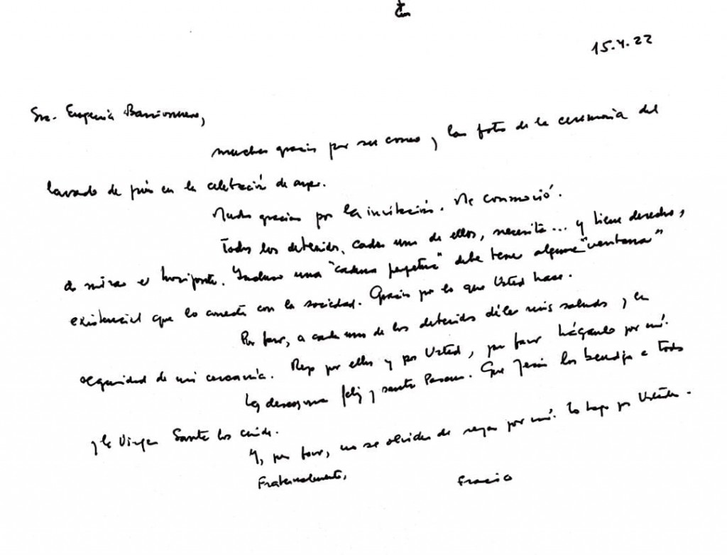 En un escrito dirigido a una de las subdirectoras de la cárcel, Francisco expresó: “Muchas gracias por su correo, las fotos de la ceremonia del lavado de pies en la celebración de ayer. Muchas gracias por la invitación. Me conmovió. Todos los detenidos, cada uno de ellos necesita y tiene derechos a mirar el horizonte. Incluso una “cadena perpetua” debe tener alguna “ventana” existencial que lo conecte con la sociedad. Gracias por lo que usted hace.