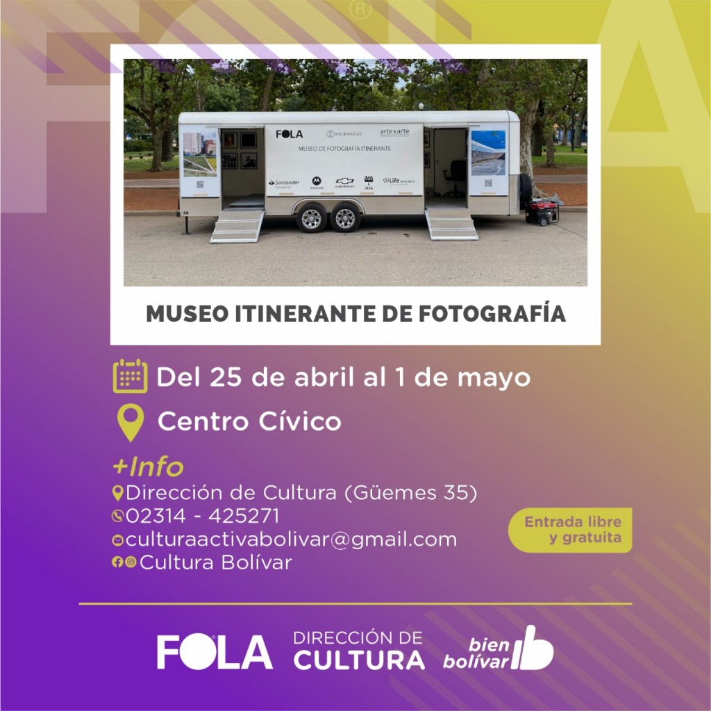 La Fototeca Latinoamericana FOLA, que estará en Bolívar del 25 de abril al 1 de mayo, es el primer museo argentino dedicado exclusivamente a la fotografía, que lleva una exposición de artistas en un trailer cultural, a lo largo de 7.200 kilómetros del territorio argentino.