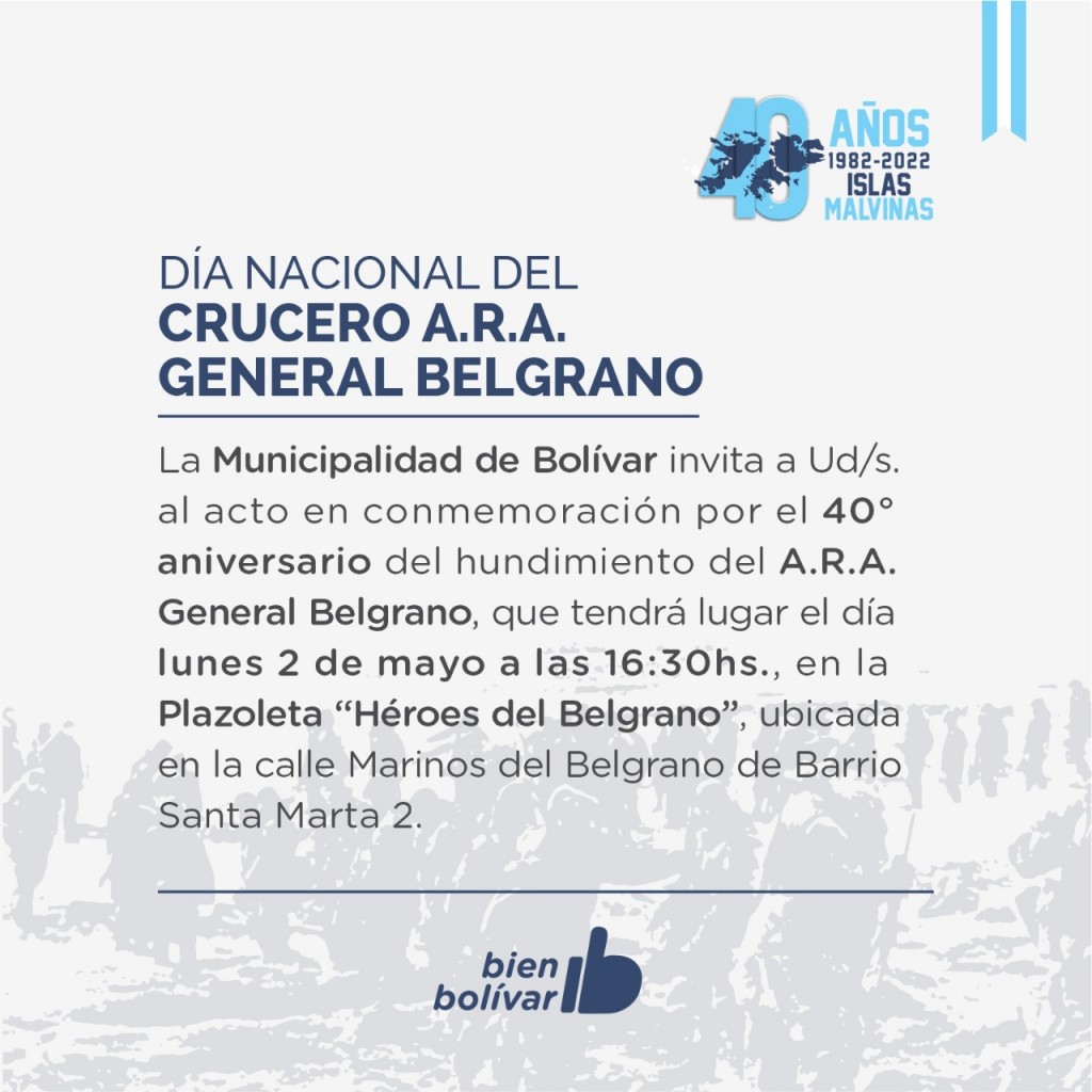 Este lunes 2 de mayo a las 16.30hs, se llevará a cabo el acto protocolar por el 40° aniversario del hundimiento del Crucero A.R.A General Belgrano, en la plazoleta “Héroes del Belgrano” ubicada en calle Marinos del Belgrano de barrio Santa Marta 2.