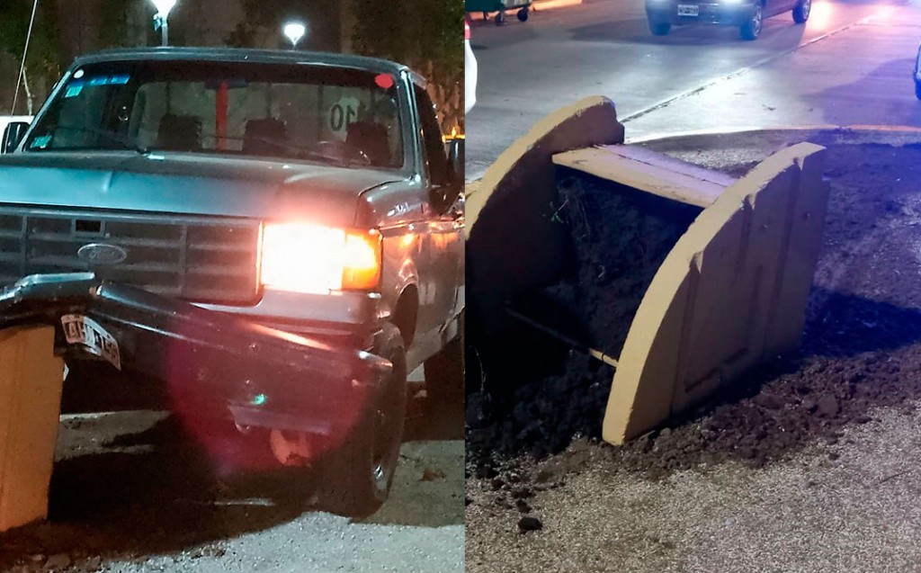 El conductor de una Ford F-100, con dominio colocado AHN-155, transitaba por la arteria principal de la ciudad, cuando por causas a establecer impactó una maceta que contenía tierra y flores sobre el sector de ramblas bajas frente al Monumento al General José de San Martín.