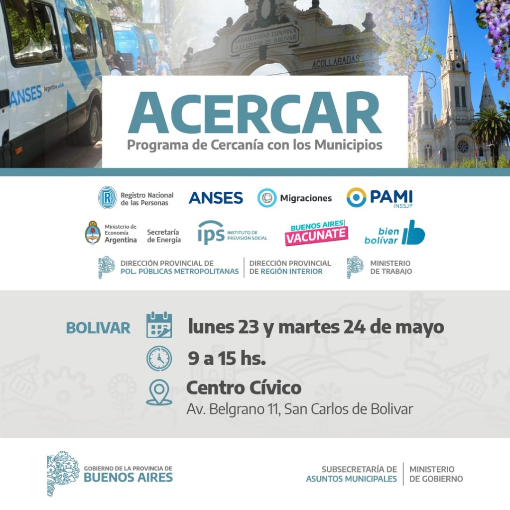 El Programa de Cercanía con los Municipios “Acercar” se desarrollará en Bolívar el lunes 23 y martes 24 de mayo.