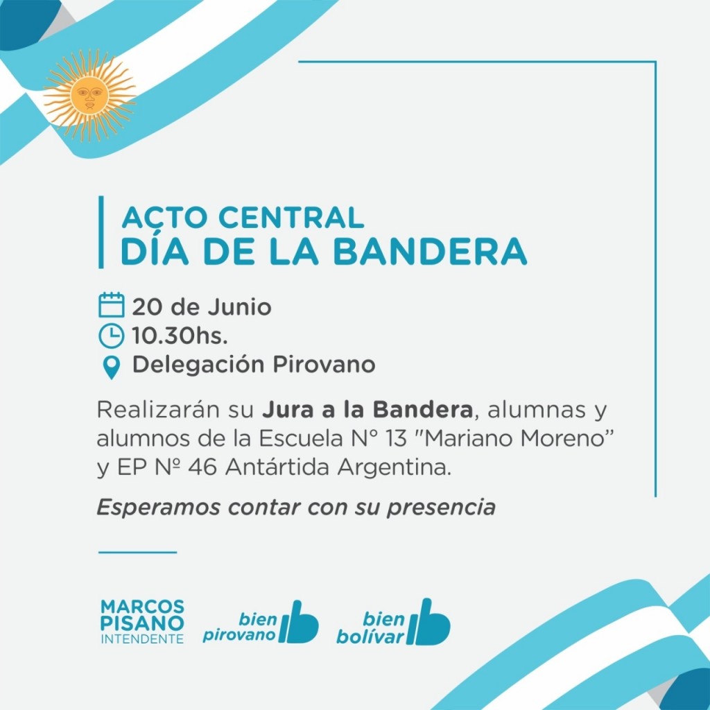 Será este lunes 20 de junio a las 10.30hs, se realizará el acto protocolar por el Día de la Bandera Nacional, frente a la Delegación Municipal de la localidad de Pirovano.-