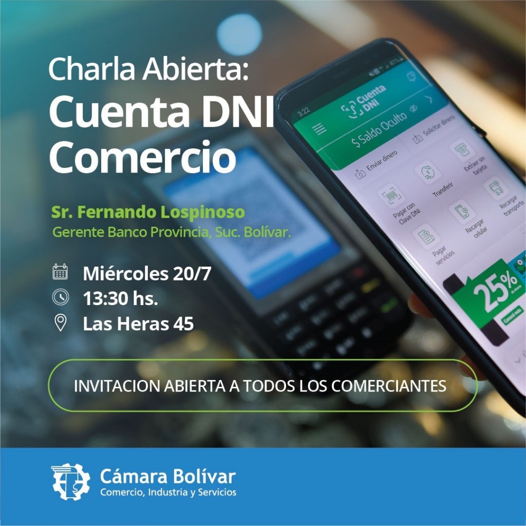 La temática será “Cuenta DNI Comiercio”, y estará a cargo del señor Fernando Lospinoso, gerente del Banco de la Provincia sucursal Bolívar.-