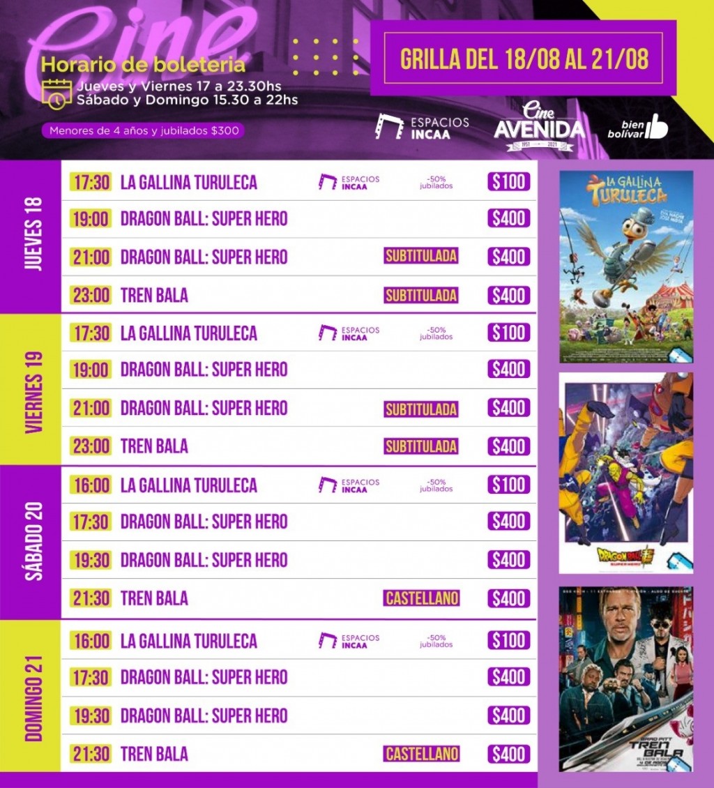 El Cine Avenida propone una cartelera variada para esta semana con el estreno de “Dragon Ball: Súper Hero”, la propuesta del Espacio INCAA esta semana es “La Gallina Turuleca”, y continúa el thriller de acción estadounidense “Tren Bala”.-