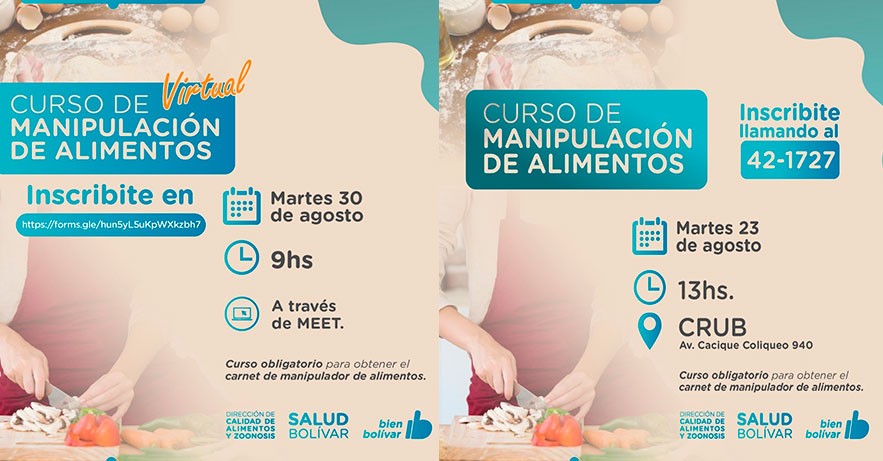 A través de la Dirección de Calidad de Alimentos y Zoonosis, la Municipalidad dictará un nuevo curso de manipulación de alimentos el martes 23 de agosto a las 13hs en el CRUB, Av. Cacique Coliqueo 940.-