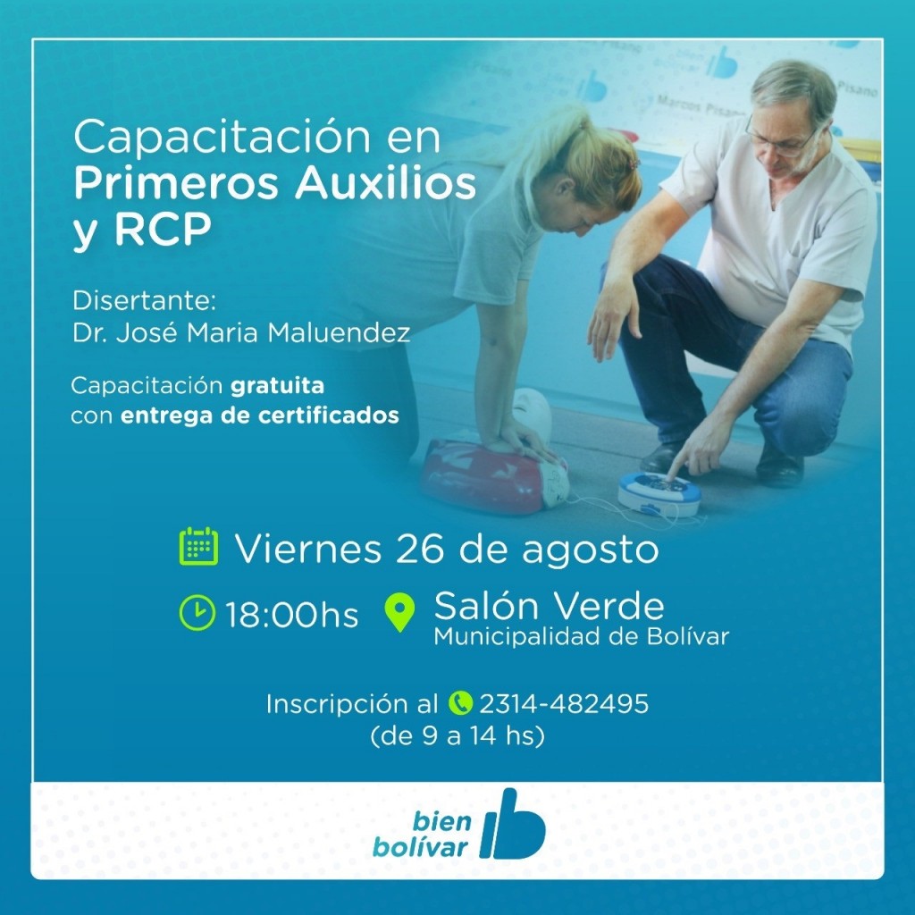 El viernes 26 de agosto a las 18hs, en el Salón Verde de la Municipalidad, tendrá lugar un nuevo taller gratuito de Primeros Auxilios y RCP.-