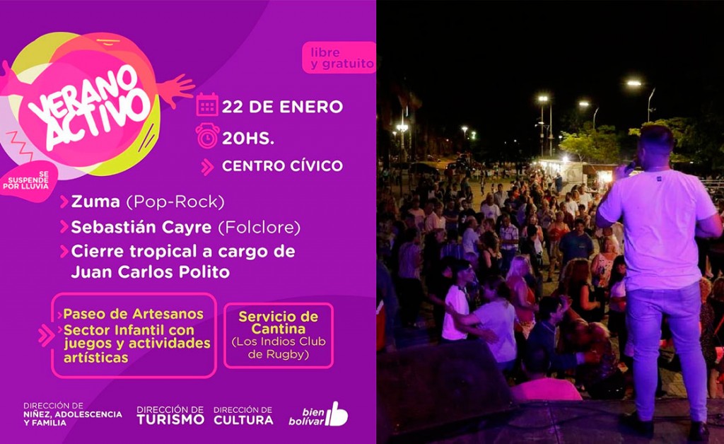 La propuesta municipal Cultura Activa tendrá lugar el domingo 22 desde las 20hs en el Centro Cívico con la presentación de la banda local del pop-rock Zuma, el folclorista oriundo de Pellegrini y radicado en Bolívar Seba Cayre, y el cierre tropical de Juan Carlos Polito.