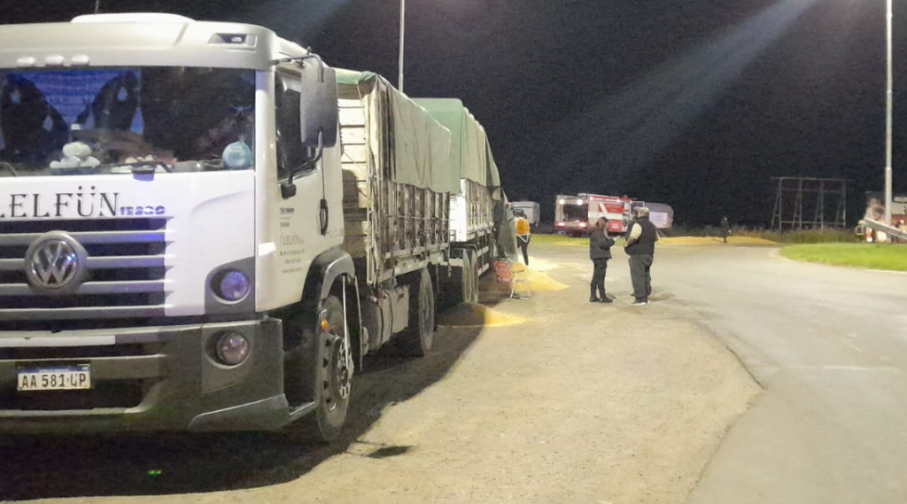 Tras el impacto en el lateral de un acoplado se produjo el derrame de trigo sobre la cinta asfáltica, que Bomberos Voluntarios se encargaron de limpiar y minimizar riesgos