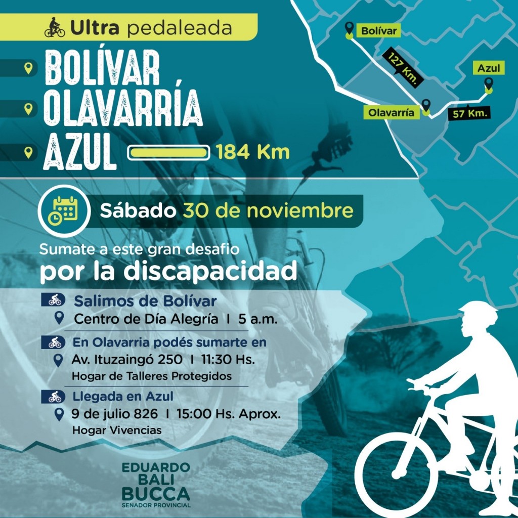 El próximo sábado 30 de noviembre, se llevará a cabo la Ultra Pedaleada Bolívar - Azul, una jornada solidaria que invita a ciclistas a sumarse a este desafío en apoyo a la discapacidad. Esta actividad, organizada por el senador provincial Eduardo "Bali" Bucca, busca promover la inclusión y la visibilización de las personas con discapacidad, recorriendo 184 kilómetros entre Bolívar y Azul.-