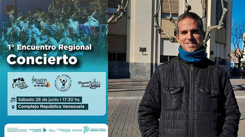 Bien, con respecto a lo de ser una nueva región, estamos incluidos en una región un poquito que ya venía funcionando, con una orquesta que se formó en el mismo año que nosotros, que es la Orquesta Escuela de Lobos, que viajan para acá. Y con dos orquestas nuevas, de manera que apuntalando a estas orquestas, que son 25 de mayo y Las Flores, el encuentro va a ser el día 28 de junio, es decir este sábado. Los chicos van a compartir una primera parte en la ENET, con talleres, clases, actividades socioeducativas, y almuerzos. Después habrá una segunda parte en el Complejo República Venezuela, en donde van a ensayar todos juntos, y finalizará con un concierto, con entrada libre y gratuita a la comunidad, a las 17.30 horas. Se trabaja también ese talento que se aloja en los alumnos y la Orquesta Escuela trabaja actualmente con chicos entre 4 y 20 años, en realidad 18, pero tenemos chicos de 20, exalumnos que van quedando.