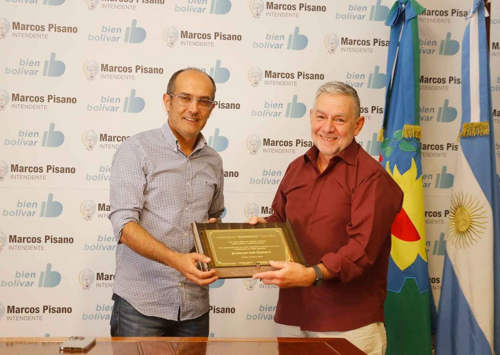 En un emotivo encuentro, el intendente Marcos Pisano reconoció a Marcelo “Chamaco” Valdez, quien este miércoles 15 de octubre tendrá su última sesión en el Honorable Concejo Deliberante de Bolívar, culminando una extensa y destacada trayectoria de 36 años de trabajo comprometido, cercano y al servicio de la comunidad.-